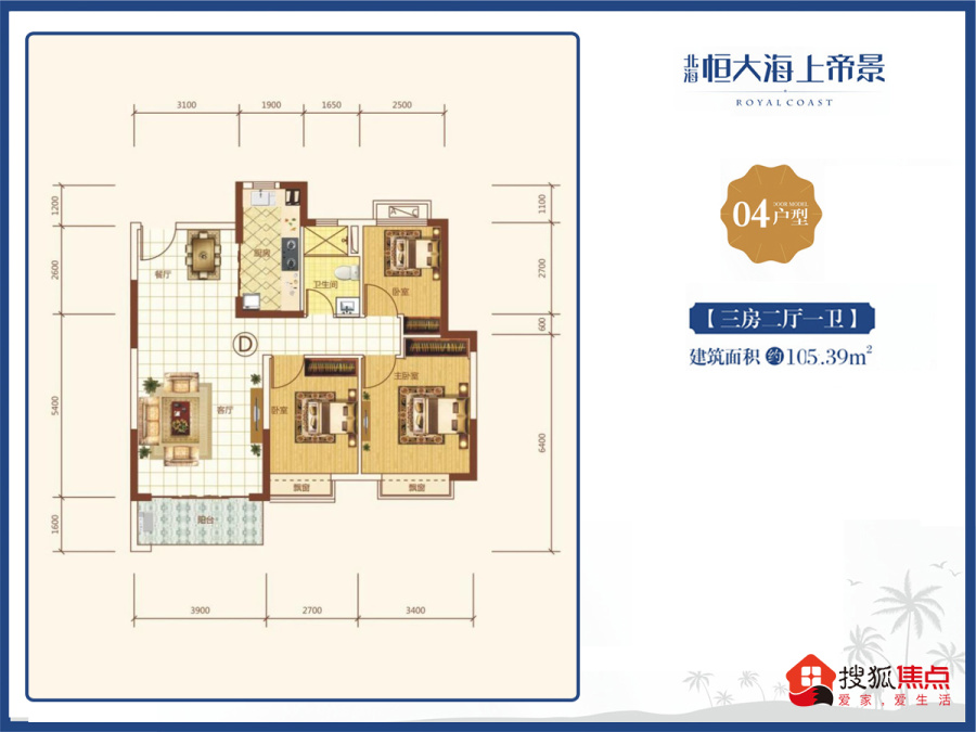 04户型 建面约105平 三房两厅-3室2厅1卫-105.39㎡