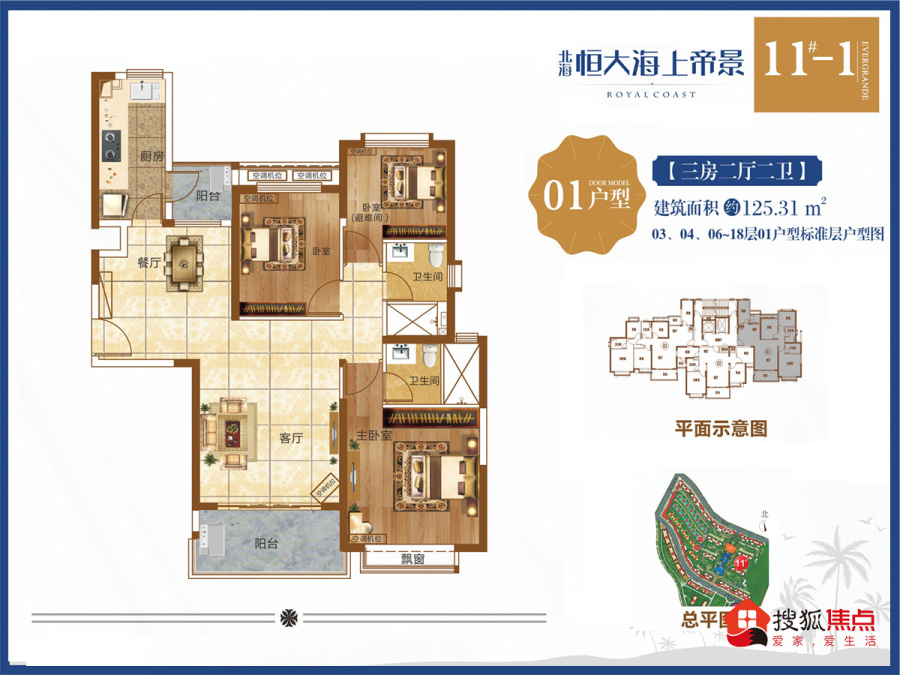 01户型 建面约125平 三房两厅-3室2厅2卫-125.31㎡
