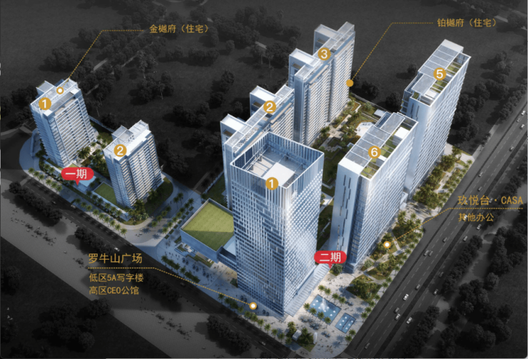 项目总占地约60亩,总建面约23万m,分两期开发。一期由两栋高层住宅及商业裙楼组成;二期由2栋高层住宅、2栋其他办公(商办CASA)、1栋5A写字楼及商业配套组成。