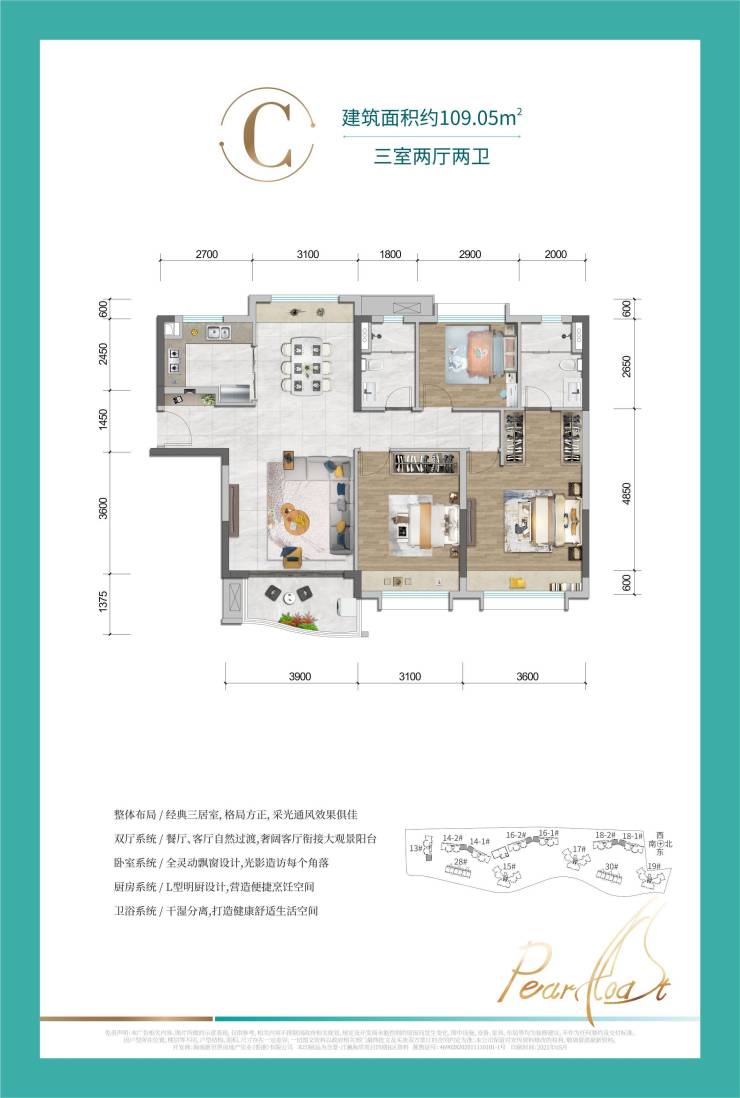 C户型-建筑面积约109㎡ 三室两厅两卫:格局方正,采光通风效果俱佳