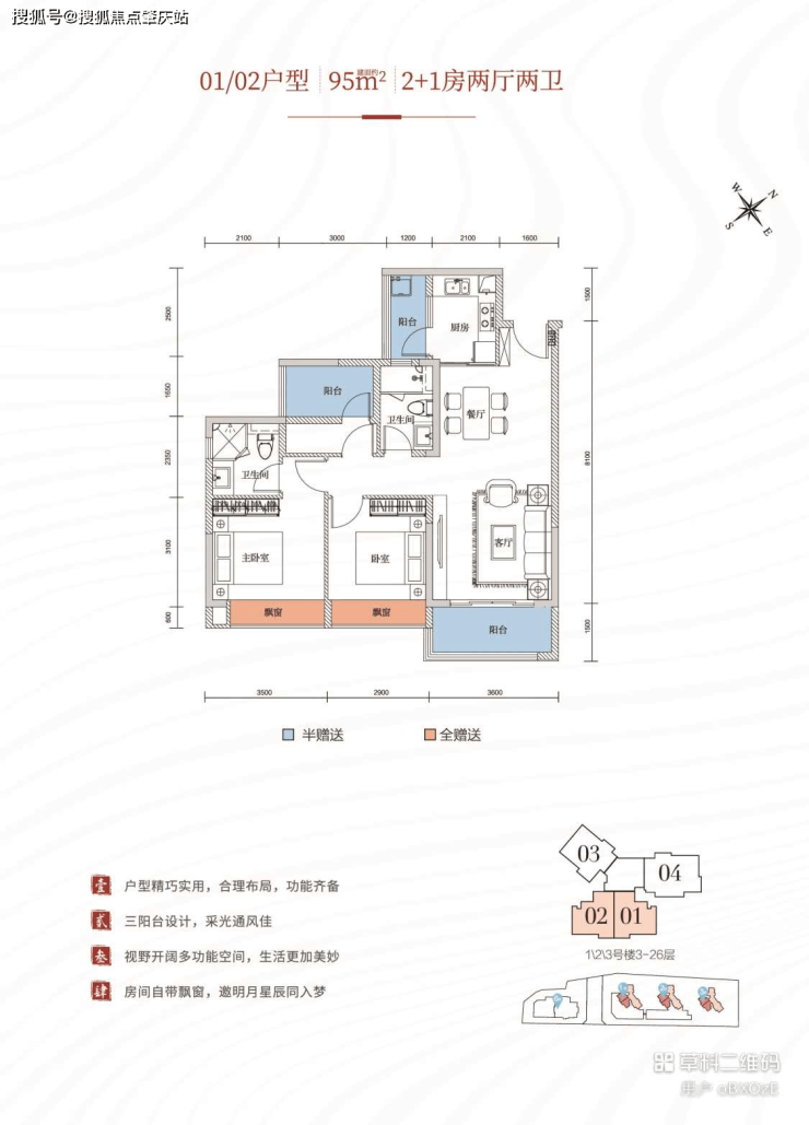 高拓展N+1户型,同样的面积,多一房空间 房型方正,客餐厅合理布局,整屋分而不离 南北通透,全明户型,四时有光,推窗即景 三室朝南,大横厅设计,连接超大景观阳台 私密主卧独立卫浴,设瞰景飘窗,大面宽采光