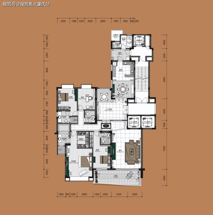 C户型:建面约297.67㎡、四房两厅五卫+工人房+超大入户花园(豪装)