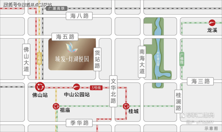 项目位于禅桂核心板块,千灯湖及祖庙双商圈中心,3⃣号线、5⃣号线双地铁交汇,地铁中山公园站旁,高铁佛山站TOD,是集交通、商业、教育、医疗、休闲等配套于一体的舒适纯居社区。