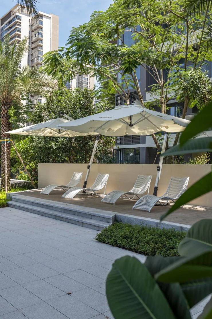 项目采用围合式布局,共享景观最大化,实现户户有景,部分楼栋享泳池景观。部分楼栋楼下即寻鲲泳池,消暑不远行,夏日享清凉。 项目打造四季雨林主题园林,匠造五感社区,从“成长、社交、 运动、自由、艺术“五大维度,营造四季24小时沉浸式美学生活场。