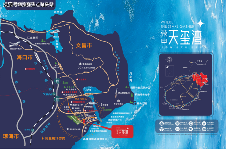 醇熟城市湾区文昌高隆湾,市政府旁,椰子大观园与清澜中心公园畔;文昌新城区发展十字金轴(疏港大道与文府路),新城核芯地段。