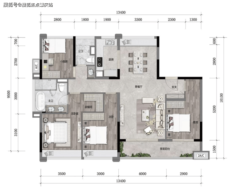 【98平三房两卫】超3.6米开间景观阳台,3面朝南,通风采光优渥,使用率超90%