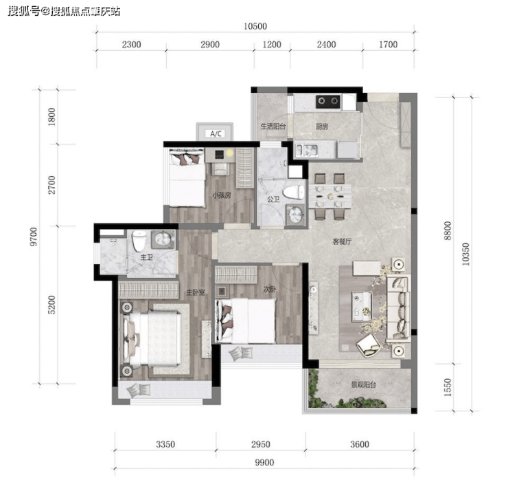中芯爆款户型 约100㎡南北对流双阳台三房