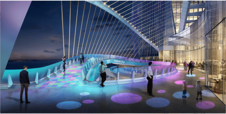 悬空30米高拉索悬桥,海口新潮打卡集结地;4.5米星空飘板,将星河璀璨映入眼眸;海的壮阔,城的繁华,夜的浪漫,尽纳视野。
