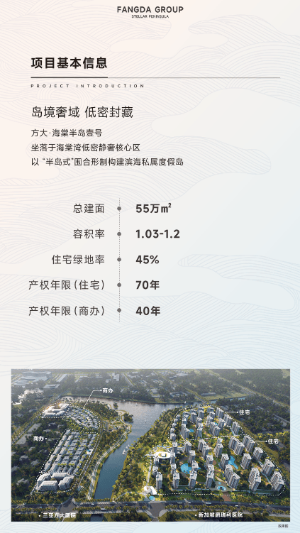 基本信息:项目位于三亚海棠湾控规 HT09-15-01 地块内,整体占地面积约 131 亩,总建筑面积约 15.84 万平方米,容积率 1.2,总户数 631 户,建筑限高 40 米,产品为洋房或小高层。