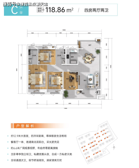 主力户型为 108㎡的 3+1 房(可改四房)和 118㎡的四房,采用南北通透设计,配备双阳台、主卧套房及 U 型厨房,空间利用率高。园区规划三级景观带(入口花园、全龄活动花园、宅间花园)和两轴景观区(泳池水景、儿童活动广场),并设有太空主题乐园、夜光跑道、星光影院等 10 余个休闲配套。