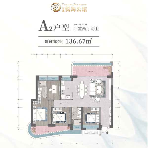 A2户型 建面约136.67㎡,四房两厅两卫