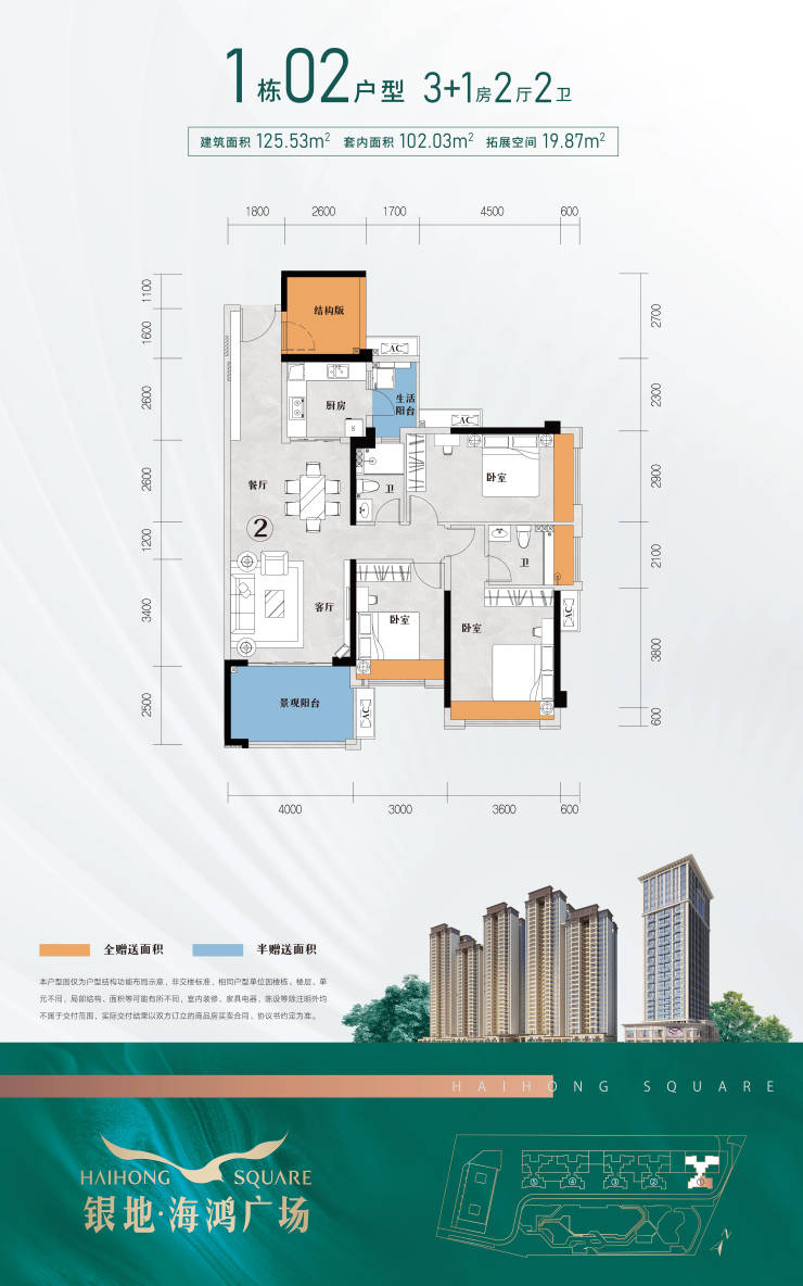 02户型:118.82m² +18.64㎡, 3+1房2厅2卫,(剩2楼,25楼)