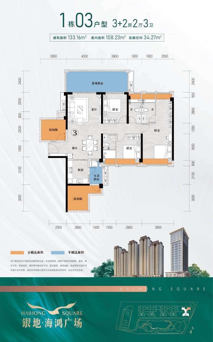 03户型 :133.16㎡ +34.27㎡,3+2房2厅3卫,南北对流