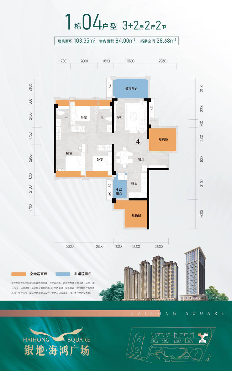 04户型 :103.35㎡ +28.68㎡,3+2房2厅2卫,南北对流