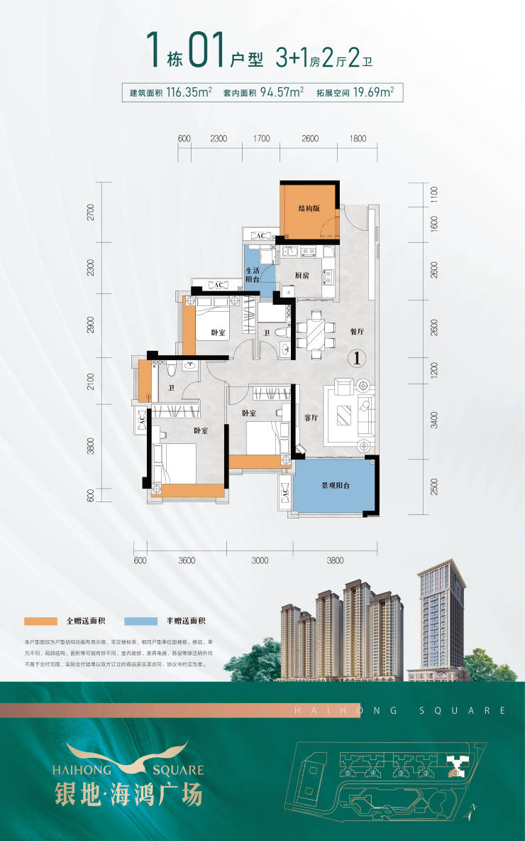 01户型:116.82m² +19.84㎡, 3+1房2厅2卫 ,(低、高层)