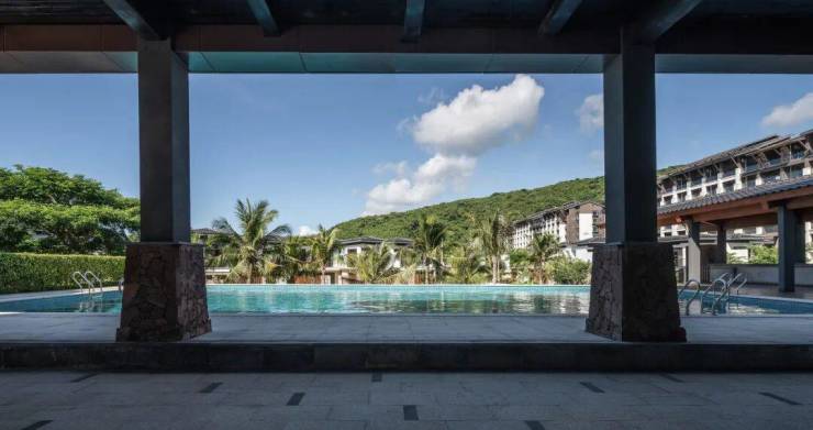 HMD从海南传统村落、街巷、庭院、水口、村头树汲取灵感,将灰色和红色的火山石,和梨花木、椰子树等海南当地木材用于院墙、栏杆、百叶、纳凉亭等,体现传统建筑文化肌理;同时采用坡度缓和的大屋顶大挑檐,体块悬空、大面积开窗的手法,打造通透开敞的空间,令建筑与自然融合。