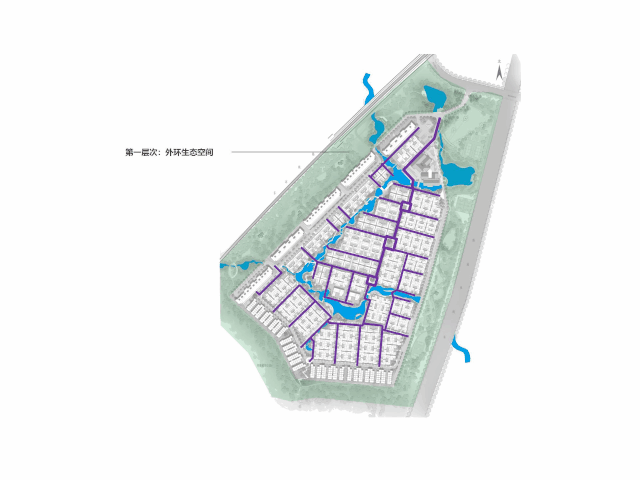 第二层次,慢调水岸空间。场地内水系空间的营造尽可能顺应基地原始水系,蜿蜒曲折、整体线性展开。各个空间形态采用点、线、面结合,丰富多样,成为场地内主要景观公共空间带。沿水体展开一系列体验丰富的公共休闲活动,营造慢调水岸生活。