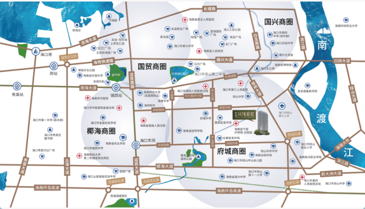 外部 “口” 字路网:椰海大道 / 琼州大道 / 红城湖路 / 龙昆南路,10 分钟到国兴 / 江东 / 海垦等商圈