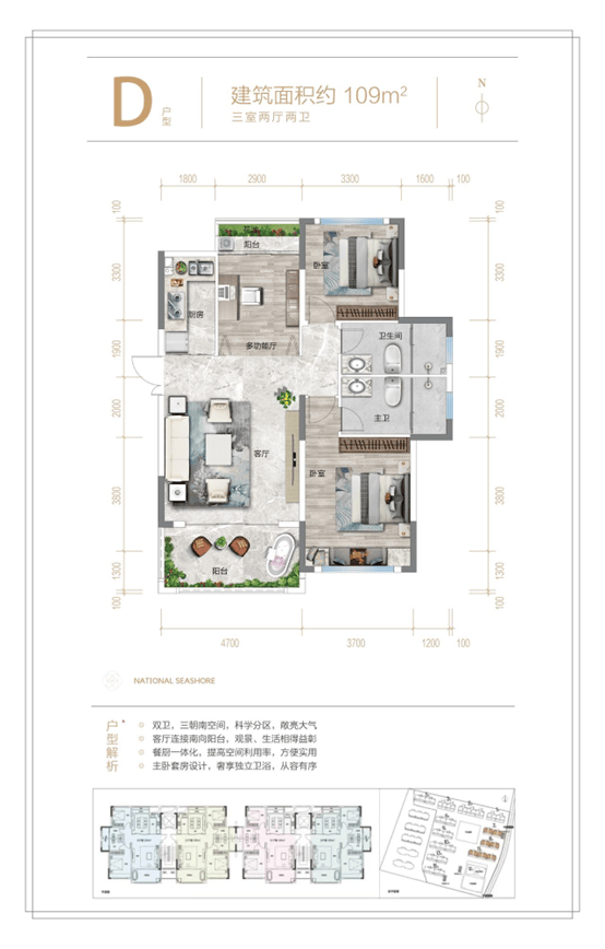 海棠壹号院全新迭代建筑面积约109-119㎡升级户型,空间布局科学合理,全明户型,南北双阳台,270°环幕视野,重新定义高端品质人居尺度。