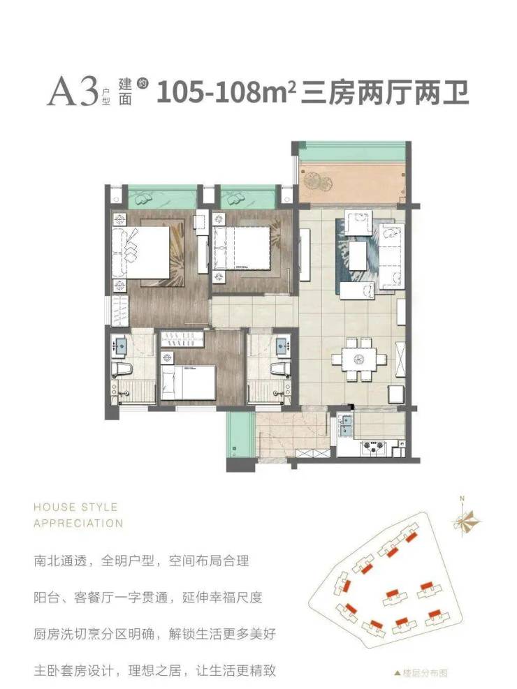 在售户型:103㎡,105㎡三房两厅两卫,128㎡,139㎡四房两厅两卫