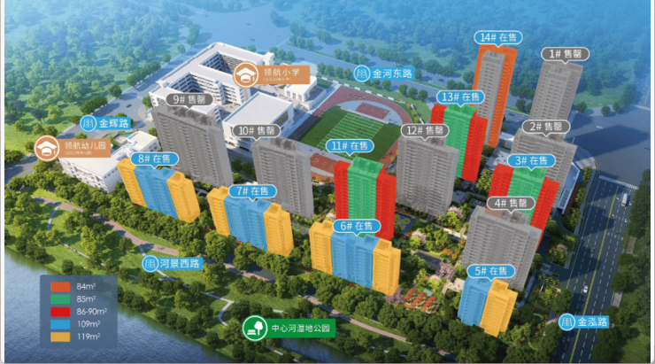 航空新城稀缺的一线滨河景观,紧邻金湾中心河湿地公园,坐享中心河湿地公园头排景观。
