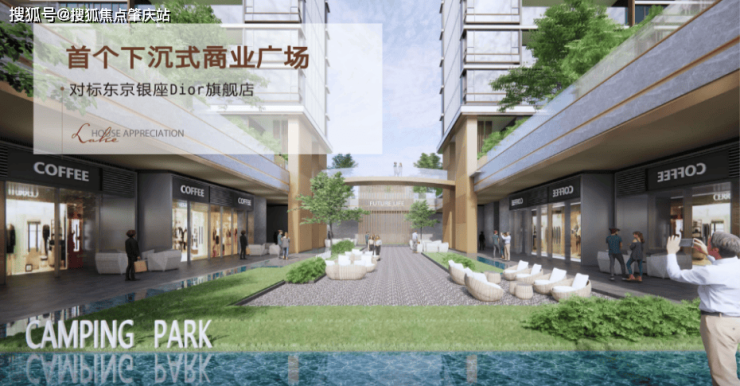 在下沉庭院两侧的纵向布局上,底层是我们的精奢商业体,项目商业外观则参考了东京银座Dior旗舰店的简约线条来设计打造首个下沉式商业广场,满足餐饮/超市/培训机构等各类业态(具体以实际业态交付为准)。