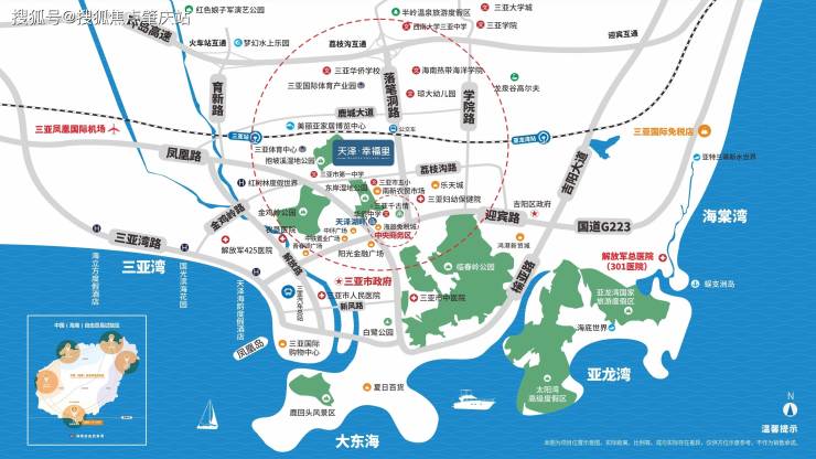 “全省规模最大的三亚市妇幼保健院”距离项目约500米;项目周边有三亚市人民医院、农垦医院、三亚市中医院等“三甲医院”以及解放军425医院,解放军301医院;