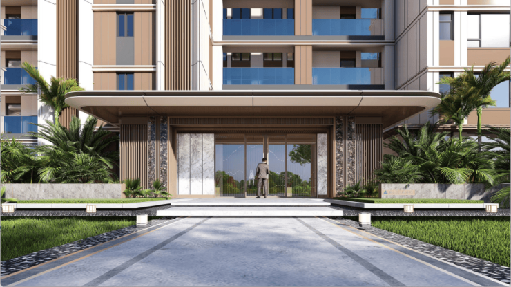 门廊两侧立柱使用英国棕石材与金属格栅的结合,让入户大堂更显大气稳重,带来精致、轻奢的归家体验。