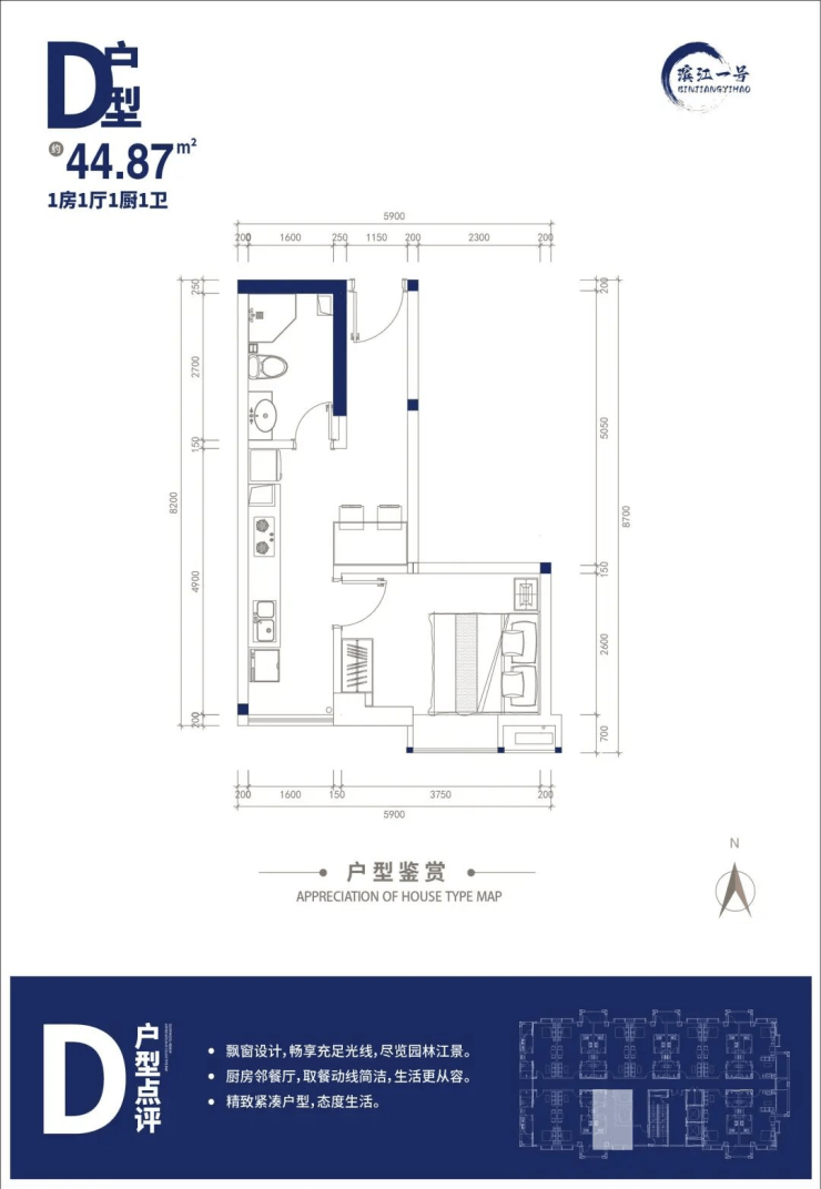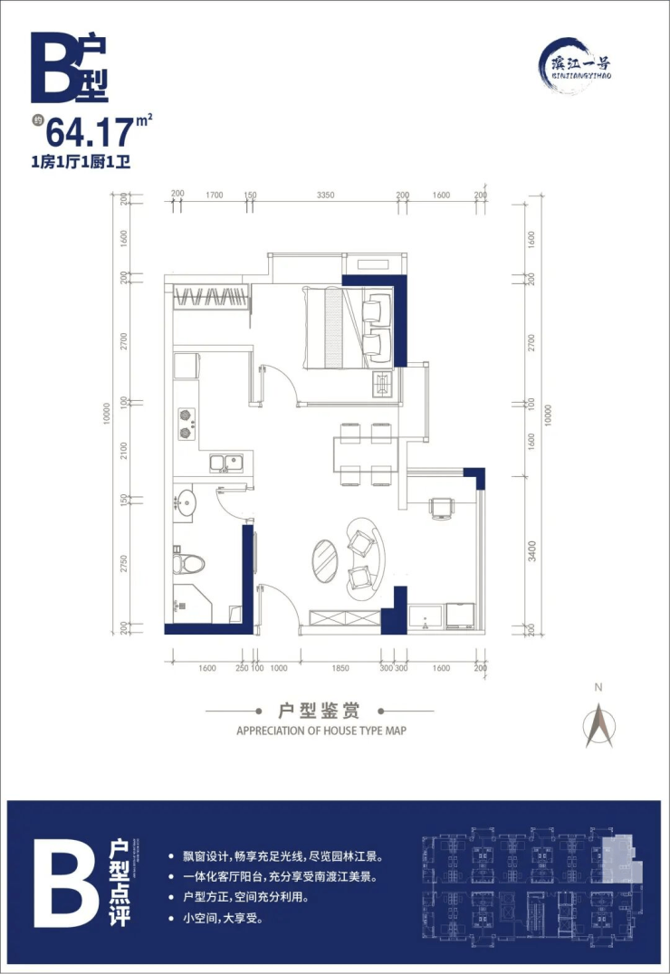 面积段:户型面积 44-64㎡,主力户型有 44.87㎡一房、57.25㎡、59.46㎡、64.17㎡两房。