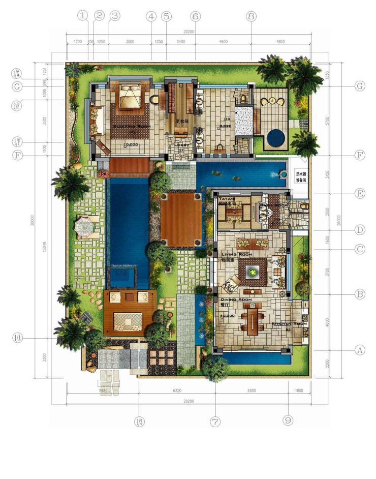 庭院西部双卧室对称而立,配套卫生间与室外淋浴间,尽赏超大泳池景观,起居室与餐厅、家庭室浑然一体,共赏中心庭院水木清华,四季芳菲愉悦身心。设保姆间、洗衣间、卫生间与中式厨房,主仆区域分明,大家风范可见一斑。