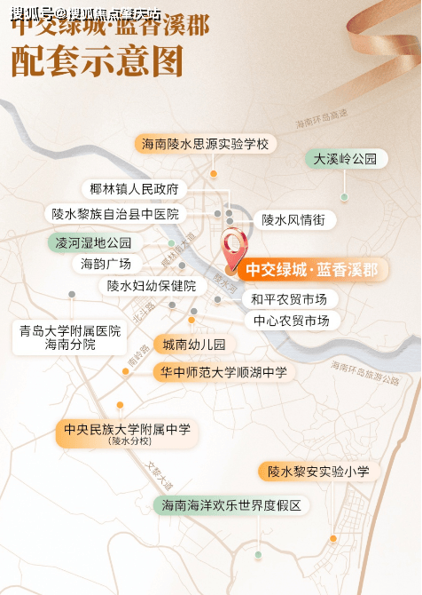 医疗:陵水人民医院(4.8公里)、中医院(2.7公里)、陵水妇幼保健院(2.7公里)、青岛大学附属医院海南分院(13公里)、301急救中心绿色通道