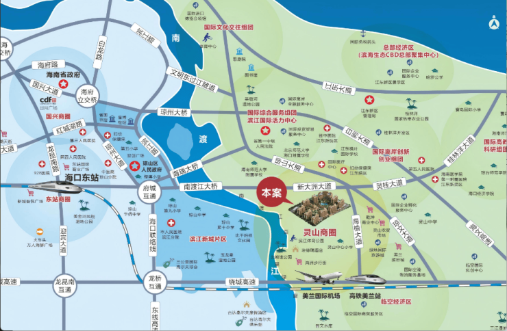 海口重点打造的滨水文化宜居板块,以"一岛两带两区三片"为核心规划,融合文化、生态与产业功能,未来将成为集休闲居住、商务办公于一体的生态宜居新城,本案临江对望滨江新城,共享城芯繁华配套。