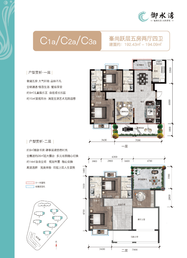 🏡空中别墅:建筑面积约192-194㎡五房两厅四卫
