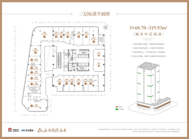 【楼栋概况】楼体高度110米,地下二层地上22层,1-4层为城市中芯底商,首层层高约6米、2层层高约为4.5米、3/4层层高约为4.35米;5至18层为国际商务空间,层高约为4.2米。