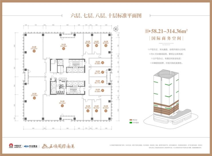 【楼栋概况】楼体高度110米,地下二层地上22层,1-4层为城市中芯底商,首层层高约6米、2层层高约为4.5米、3/4层层高约为4.35米;5至18层为国际商务空间,层高约为4.2米。