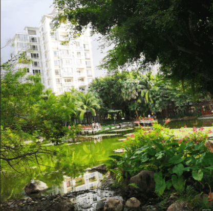 绿化率与容积率:绿化率 45%-52.6%,容积率 2.5,园林以热带植被和水系景观为主,设有休闲步道和垂钓湖。