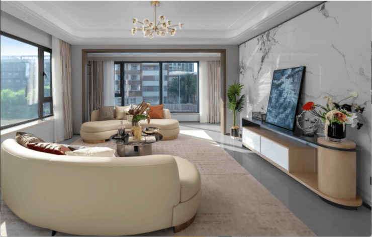 颜值墙面:电视背景墙采用整面大理石岩板铺贴,沙发背景墙采用木饰面+布艺硬包,主卧背景墙布艺硬包
