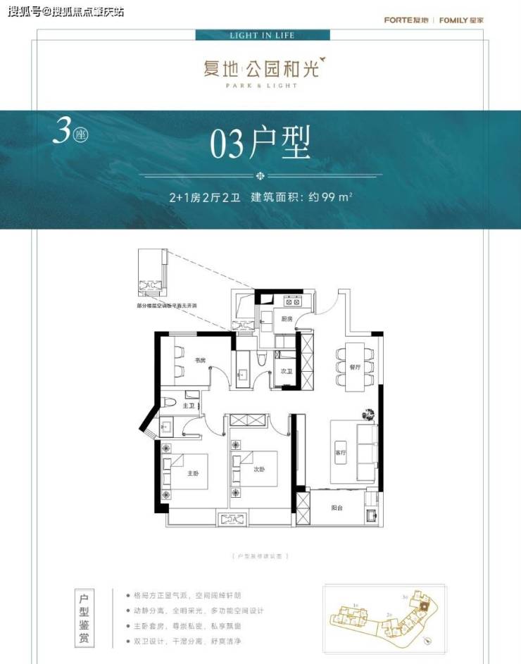 二、项目简介复地公园和光是由世界500强——复星国际携手复星医药旗下的禅城中心医院打造全国首个三维健康住宅,是复星国际旗下首个三甲医院赋能的“健康住宅”。项目总占地约3万㎡,建筑面积约21万㎡,包括两栋32层和一栋42层的超高层物业。其设计理念围绕“三维健康”展开,包括全家健康、全生命周期健康和全领域健康三个维度,旨在按照建筑界的奥斯卡标准,打造“WELL铂金级全认证健康住宅”(认证中),并形成一个24小时闭环的健康、绿色、幸福生态圈。
