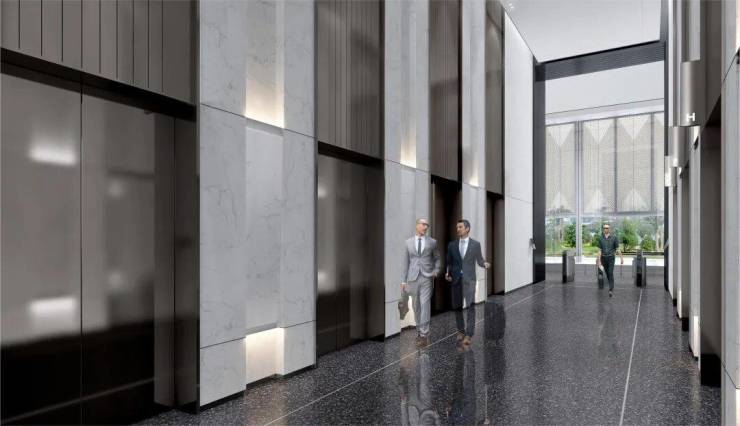 NO.1317部三菱高速电梯|为企业办公加速高区5部、中低区4部进口三菱电梯,最高6m/s提速;平均等待不超40秒