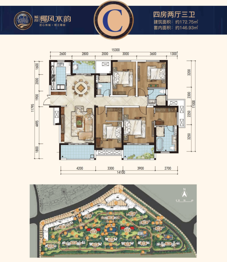 C户型:建面约172.75㎡四房两厅三卫