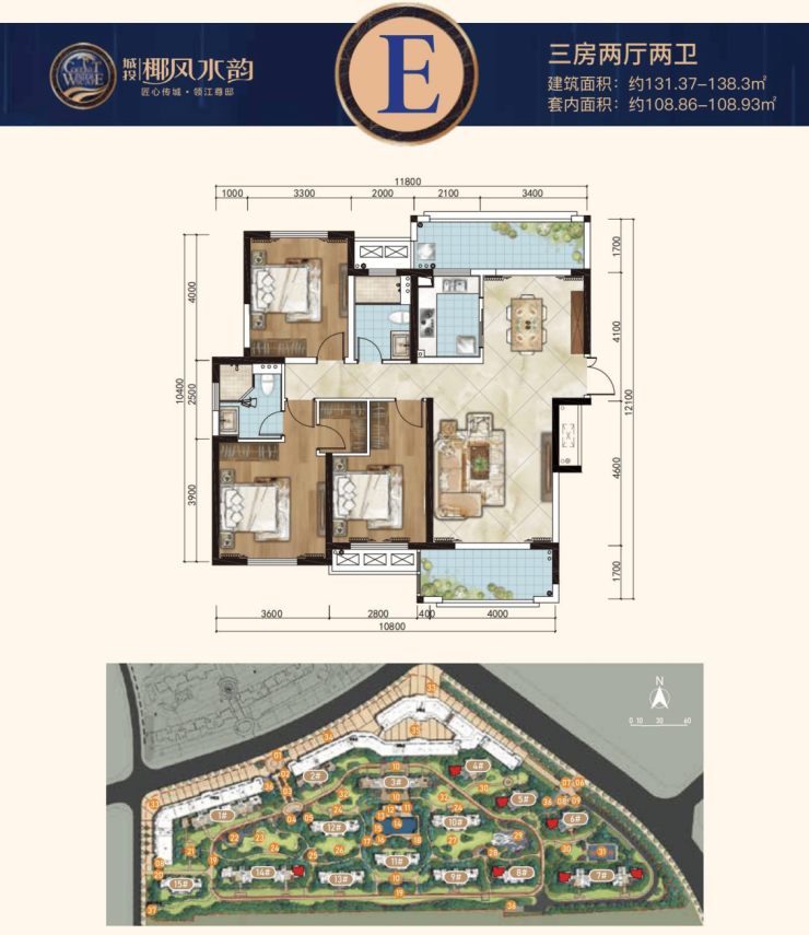 E户型:建面约131.37-138.3㎡三房两厅两卫