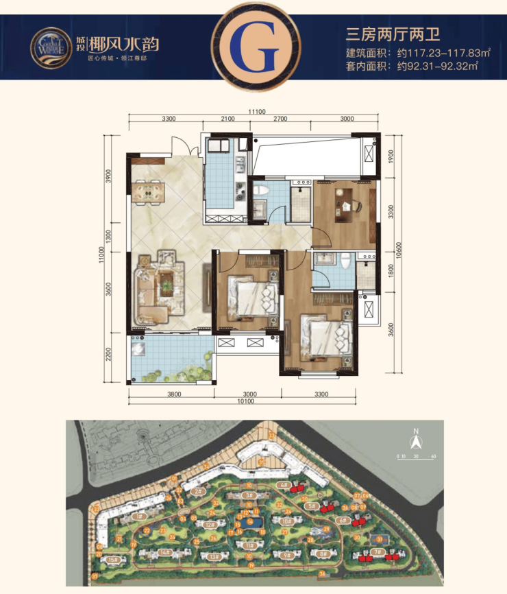 G户型:建面约117.23-117.83㎡三房两厅两卫
