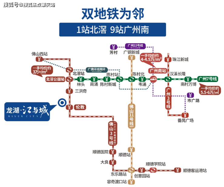 ③地铁红利:广州地铁7号线顺德段预计今年底开放,地铁开通预计带动北滘新城房价进一步抬高(目前已达3.5万+),本案距北滘新城仅2站地铁距离,房价差1万/㎡!