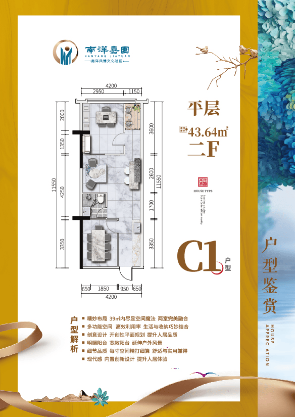 🏠 C1户型 平层 约43㎡ 两室两厅一卫