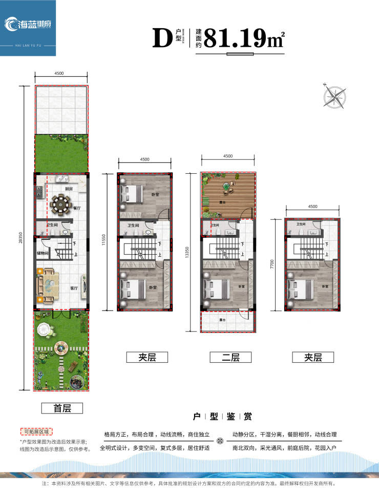户型建筑面积81.19㎡,拓展后实得使用面积约263.04㎡(含前后花园),独门独户、有天有地还带前后花园,满足日常生活的不同需求。
