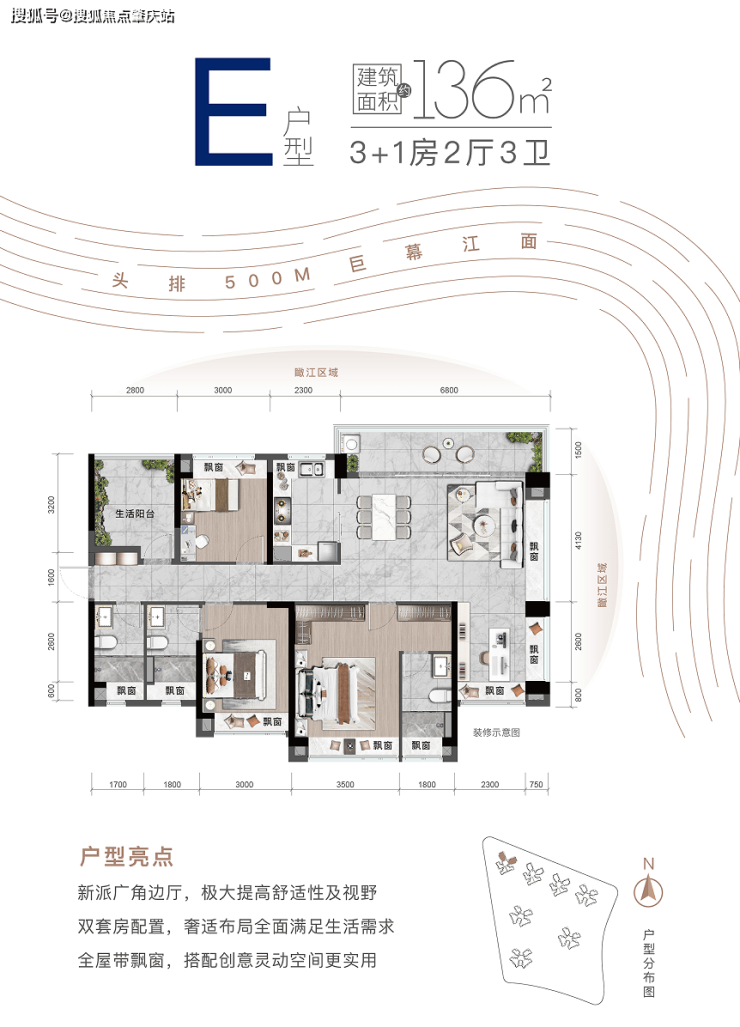 楼王1栋(毛坯):亲江96㎡3房2卫/江幕136㎡4房3卫