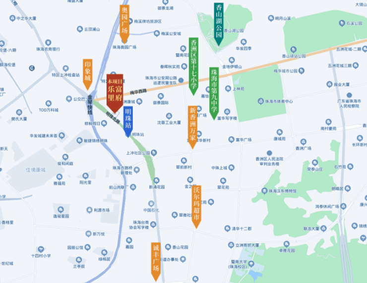 1、乐富里项目位于梅华路与明珠路交汇处,紧靠明珠轻轨站。项目由珠海市明隆发展有限公司投资开发。