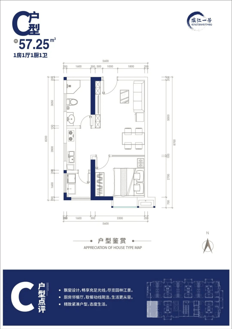 面积段:户型面积 44-64㎡,主力户型有 44.87㎡一房、57.25㎡、59.46㎡、64.17㎡两房。
