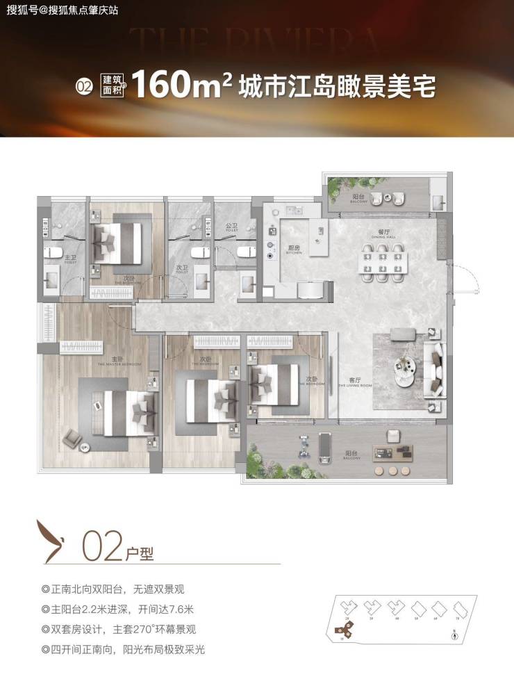 02户型 建筑面积约142㎡景观高配大四房LDKG全场景,客厅无剪力墙可拓展达到60㎡东南朝向,享半月岛及酒店式内园林双景观主人房270°转角落地窗设计拓宽生活场景