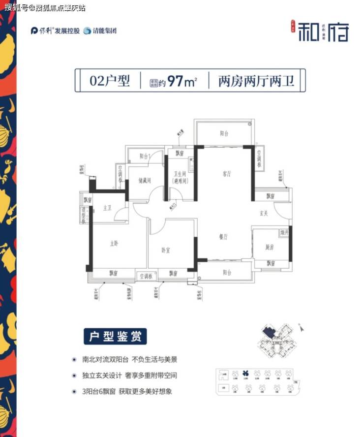 约97㎡:3阳台5飘窗,南北对流双阳台,珍稀爆款